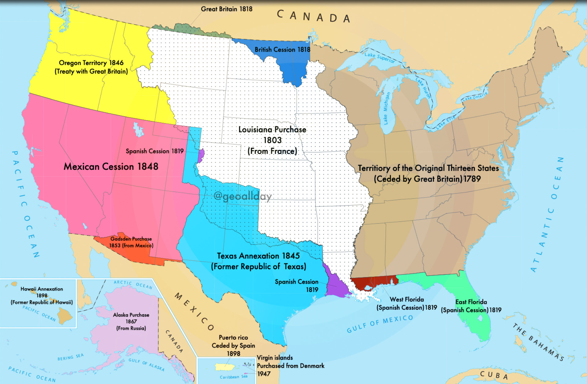 Which brings me to a recent comment by a certain talented musician who, like most musicians, should never be allowed to speak. She claimed that the United States was on stolen land. Please don’t misunderstand, as I’ve written about extensively, the people who lived here before colonization have gotten a bad deal, and their communities are still in terrible shape relative to every other ethnic group in our country that a demographer could subdivide. The suffering of living American Indians is something that I think is a grave injustice, and there should be an attempt on the part of our government and people to right those myriad injustices beyond reservation casino licenses. However, words have meaning, history matters, and slogans are usually pretty stupid. As with “Remember the Maine” or “Remember the Alamo,” slogans should be relegated to and understood as effective war propaganda, and never confused for history or public policy. So, with that in mind, no one that I know of in the public discourse has bothered to point out, or perhaps even noticed, that when the United States was formed, every inch of territory of the continental United States had already been stolen, conquered, or claimed by some European power. The British Empire ceded all lands north of East and West Florida, and East of the Mississippi and south of modern-day Canada to the newly formed US Government and its people by treaty in 1789. The Louisiana Purchase was exactly that, a purchase made in 1803 from Napoleon’s nascent empire. Napoleon, of course, had stolen the French Government in a coup, so the land, technically, was claimed by a Bourbon monarchy that no longer existed–so the land’s ownership was already in a tenuous and disputed (by Spain) condition. As written above, Spain ceded ownership of the Floridas in 1819, land it had stolen/claimed/conquered hundreds of years earlier. The Mexicans stole Texas from the Spanish, and then the Texans stole it from the Mexicans before the US government annexed it in 1845. Likewise with much of what is now the Southwest including California, which the Mexicans lost to the United States in the treaty that ended the Mexican-American War in 1848 (a war where the Americans conquered literally all of Mexico, which in the treaty, they gave back to the Mexicans). The Gadsden Purchase of 1853 rounded out the Southwest’s current borders; once again, it was a purchase. And the Oregon territory was ceded to the US in 1846, also by treaty, ending the dispute of who would control it, as it had been stolen/claimed/conquered by both the British and the Russians who would sell Alaska to America in 1867. Hawaii is, perhaps, the only annexation of a current US state or territory that one might interpret as a theft, but it was more an internal political struggle against the Hawaiian monarchy (which itself had conquered only some of the Hawaiian Islands 50 years earlier from other tribes) that the US government took advantage of. But let’s grant that one, just for argument sake.